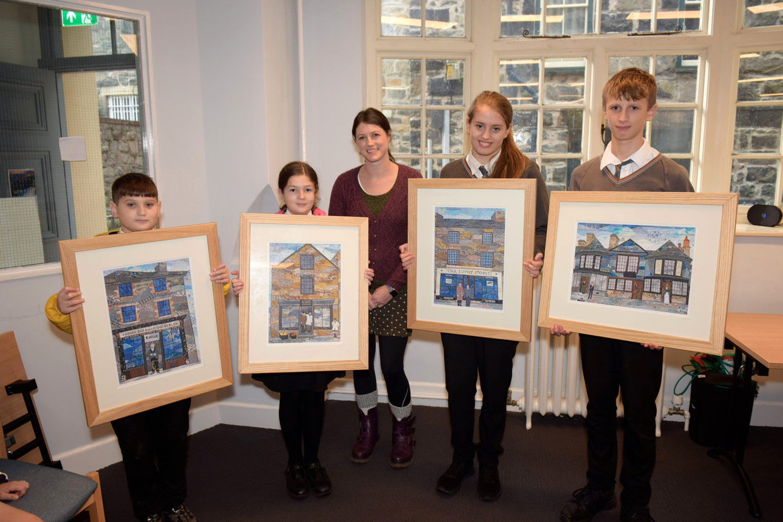 The four pieces pictured depict locations in Dolgellau. The originals are in the Free Library but four prints were presented as a gift to the school.
