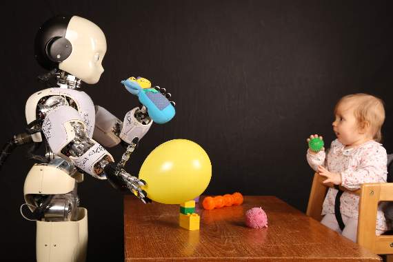 A year on, and Ayesha’s daughter Caiya features in ‘iCub and the tutor’, sitting at a table and playing with the iCub robot.