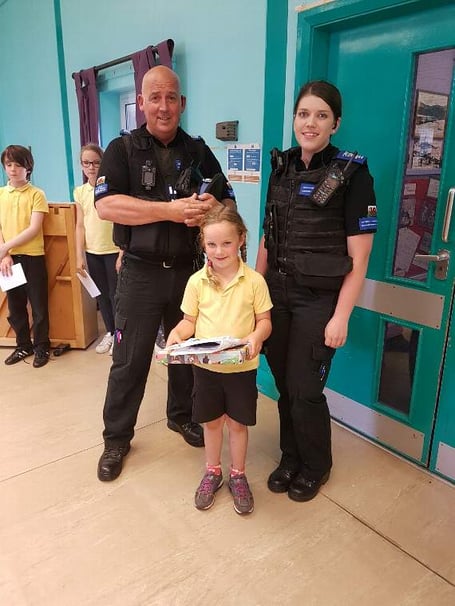 Community Support Officers Sian Davies and David Hughes have congratulated five-year-old Eve on filling out her activity booklet with “mature and charming” answers.
