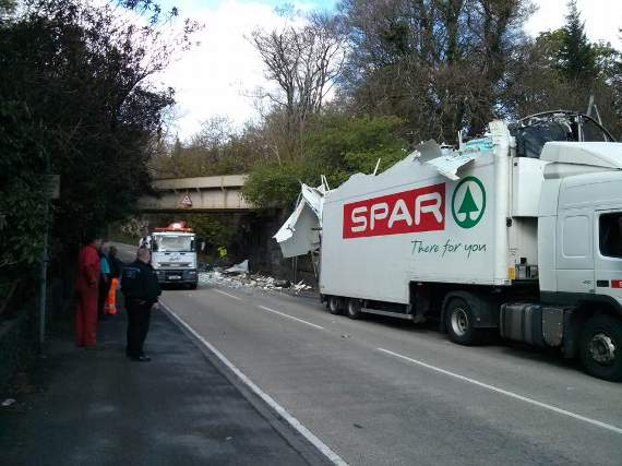 The top of the Spar lorry was ripped off in the accident at about 10.30am on the A497 between Porthmadog and Pentrefelin, smashing into Wern Railway Bridge on Penamser Road, Porthmadog.