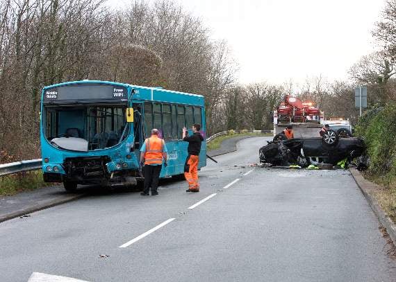 A car has flipped on to its roof following a collision with a bus on the A497 at 7.10am this morning.