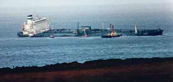 The tanker at the centre of the disaster - the ill-fated Sea Empress seen aground at the mouth of the Milford Haven. Pic. Gareth Davies Photography